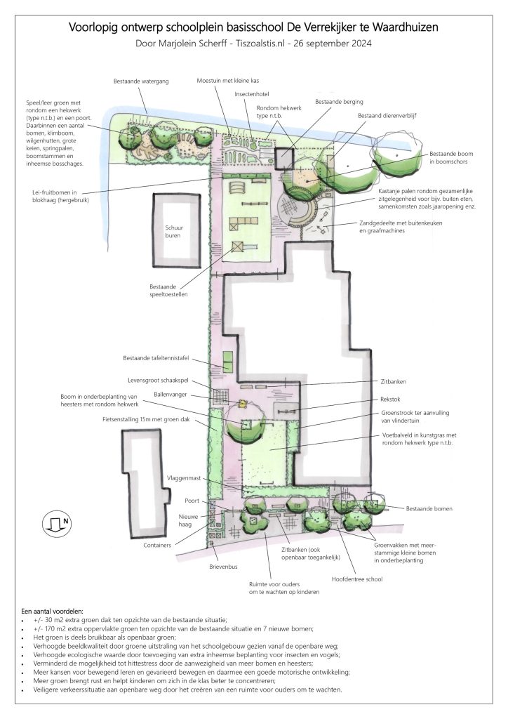 Hoe maken we ons schoolplein (nog) aantrekkelijker, maar ook groener. Die plannen zijn inmiddels uitgewerkt door Marjolein Scherff in een ontwerp van hoe e.e.a zou passen. Dank aan Marjolien voor je mooie ontwerp!